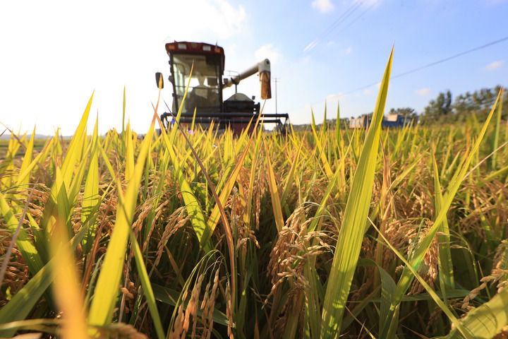 2025年10月16日,在江苏省连云港市赣榆区城头镇中青墩村,种植户驾驶收割机抢收水稻。新华社发(司伟 摄)